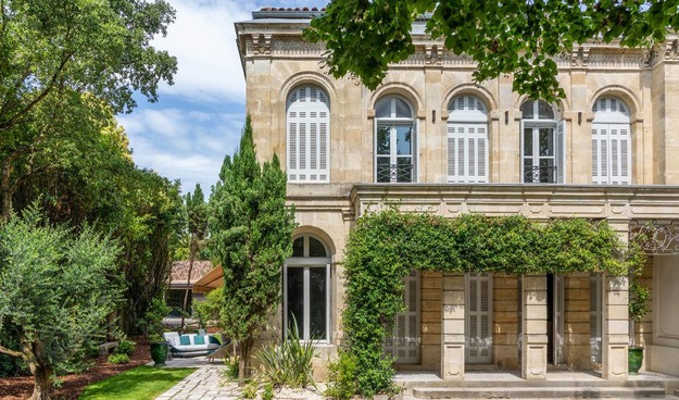 Renovated by the architect Ludovic Cochet from Bordeaux, the residence preserves the historicity of the place, as testified by the stuccoes on the ceiling and walls, painted in shades of cream and white, the wood panelling, large windows and full-height arches.