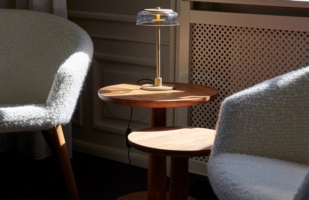 Blossi comes in a classic table lamp version, which can be moved around as needed, and a integrated in-set table lamp, which can be fixated into different types and thicknesses of surfaces. Both versions are now available in the smaller size, and in the two colour combinations; Nordic gold metal finish with clear glass or black metal with opal white glass.