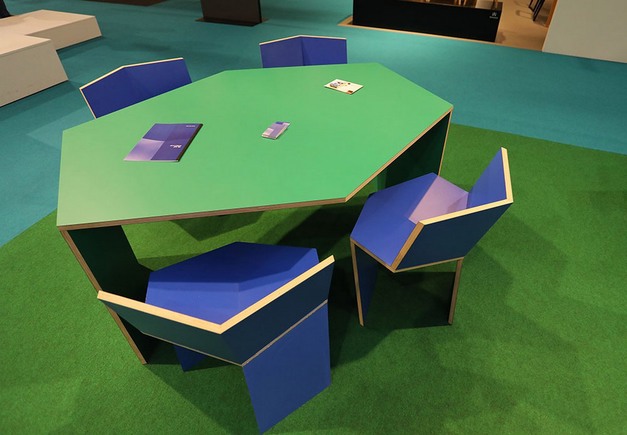The name alludes to geometric shapes and furniture panels. But also to the colour-blocking. Every block is different. The chair is a balanced mix-and-match of a diamond, a hexagon and a rectangle. This configuration invites more playful sitting positions, ranging from slightly right to left-oriented. The shape of the table is equally liberating. This too invites playfulness. All the shapes come from a single, flat panel. Vlak is a statement: this is just the beginning. Vlak and its planes will be continued….