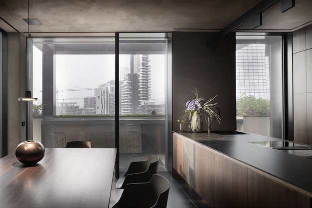 An exclusive home spread across two levels, interprets the theme of more contemporary living but features technologies and intelligent layout of spaces. The penthouse, which occupies the 7th and 8th floor of a 1970s building, enjoying a privileged point of view across the Porta Nuova skyline and exceptional brightness provided by the large windows that surround it, has become the home to a kitchen in the Atelier line by Abimis.