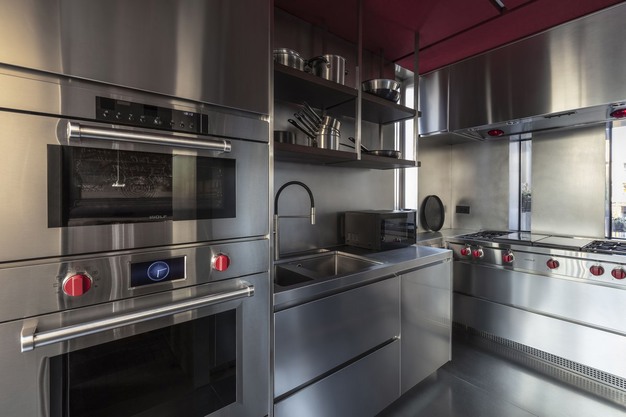 The really unusual feature of the concept is that the entire kitchen environment is made of stainless steel, including the walls, floor and ceiling, which is painted an intense red colour, broken up by lines of LED lights. This design choice was made in order to guarantee utmost hygiene, with formal and conceptual references to the kitchens of large hotel facilities. To create a chromatic bond with the ceiling and give the kitchen a decorative touch, the knobs of the hobs and ovens are also red.