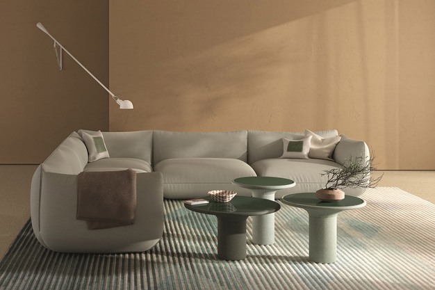 Upholstered furniture reflects a clear trend towards curved lines and comfortable seating through thick cushions. Fabrics include flat wool with subtle weaves or coarser textures, incorporating recycled yarns. The emphasis on natural tones such as off-white and greige is evident in textiles, with leather coverings in sand, terracotta, camel, or brown. Bold accent colours like natural blues and warm shades of red, rust, deep Bordeaux, along with new toffee and caramel tones, add vibrancy. Yellow accents bring a cheerful touch to the 2024 interior.