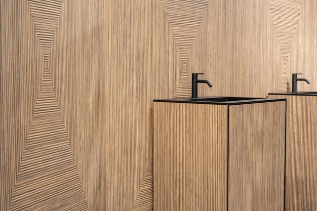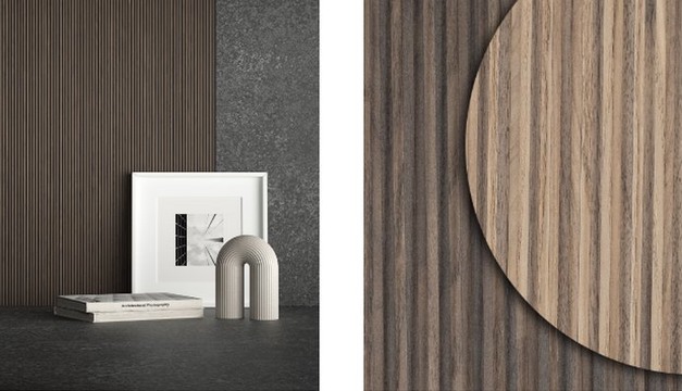 The space is articulated by the deep geometric rhythm of the "reeds" which animate the design creativity both visually and tactilely. On the one hand, the wood grains enhance the dark and light contrast, on the other, they define a soft and pleasantly undulating tactile experience. The overall result is a dance of sinuous textures, where the repeated "twirls" of Tuet's reliefs form an atmosphere of natural and dynamic well-being. Tuet's waves can be arranged in both directions, favouring different sensations of movement and spatial extension: from the bathroom to the kitchen to the living room. Giving an enveloping and balanced energy to environments, Tuet easily adapts to different styles by being combined with two new decors, 4644 Caravella Light and 4645 Caravella Dark. With a 1.5 mm thickness, Tuet is suitable for vertical applications.