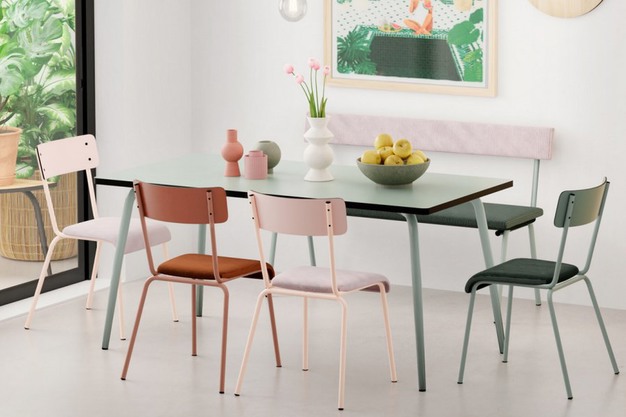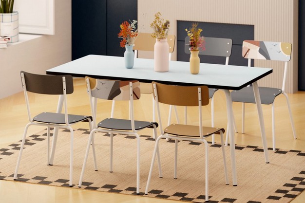 Les Gambettes is introducing a 100% recycled eco-responsible material to its new collection: recycled plastic. Used exclusively on table tops, it fits perfectly into the collection. 'Our Poly-S recycled plastic range is made from discarded kitchen utensils. This material is renowned for its strength and durability, both indoors and out in the shade.'