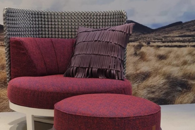 Another setting featured the seat and pouf from Mamagreen's Munia collection. The wide and welcoming support structure was combined with upholstery covered in Irisun Living fabric. On an elevated platform was the iconic Telami Regista chair made of Raytent Living fabric, testifying to an established partnership that also contemplates the famous Tripoline deckchairs.