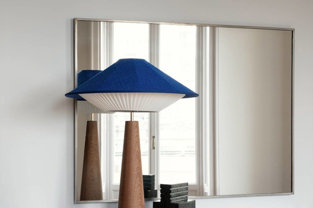The lamp comprises a conical base of solid mahogany and a lampshade that combines a fabric upper part and a pleated lower part. The lamp is available in Rubelli fabrics—also used in the suspension—and four new Dedar fabrics in electric blue, lime yellow, pink, and salt and pepper. Otto Table embodies the philosophy of Servomuto, which balances sartorial rigor and refined aesthetics with an ironic and cheeky character.