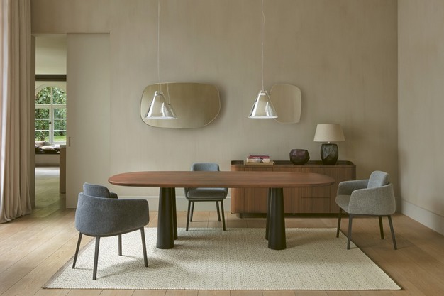 Hashira means pillar in Japanese. The Hashira table is a sculptural table made from materials both noble and honest: wood and marble. Its sculptural appearance comes from its four generously sized conical legs. Nonetheless this table has been designed not to be in the way when people sit around the table. These legs give a real presence to the table, making it very recognizable and therefore rather iconic. The sculpted appearance of the table also comes from the work on the wooden edge of the top since it is defined by a worked curve that continues in the edge of the marble.