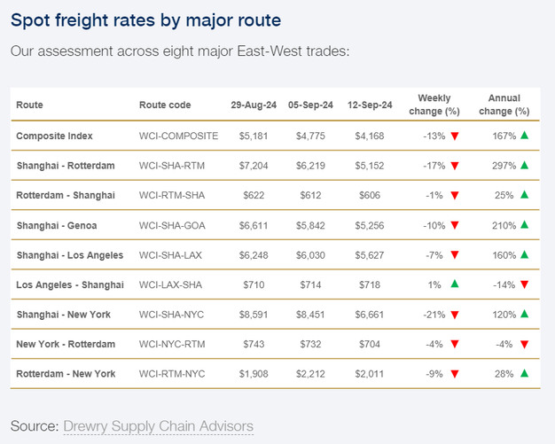 Shippers are transferring their cargo from the US East Coast to the West Coast to avoid the planned ILA strike in October, resulting in a drop in demand. This resulted in a huge 21% decline in East Coast spot rates. Due to weak demand, Drewry expects East-West rates to decrease further in the upcoming weeks.
