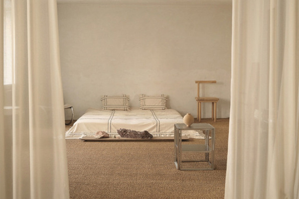 'I was drawn to the story and energy of the apartment. My father came to Denmark as a guest worker from Turkey. He's a Kurdish Turk, and it was in these premises that he opened Denmark's first Turkish restaurant, Restaurant Istanbul. Now, I've bought the place and turned it into my home. I've transformed the apartment into a large open space, replacing the old doors with wall sections, and now the rooms are divided by curtains. This creates a dynamic flow throughout the apartment. I chose a sisal carpet for the floor, which massages your feet and has a jasmine scent. The large open space serves as a music room, workspace, and bedroom, with the area around the bed made more private by the airy curtains. I've decorated the room with books and ceramics from around the world, as well as scented stones. I love stones.'