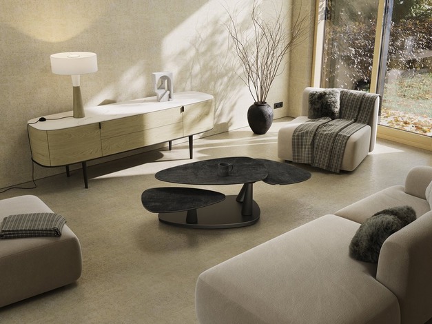 At the fair, Akante will be unveiling a variety of new pieces that exemplify its commitment to quality and contemporary design. Among the highlights is the Bonifacio, a dining table with graceful, organic curves. Its tabletop is made from a combination of 6mm ceramic and 8mm glass, providing enhanced durability and a refined look.