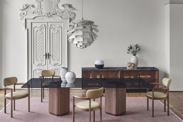 The design of the base, with its outer sections in canaletta walnut and a supporting frame in grey-stained ash, serves as the table's distinctive element. This design echoes the silhouette of the Pebble sideboard, created by the same designer.