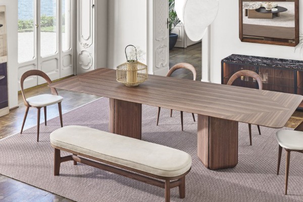 Bay is a collection of dining tables crafted from canaletta walnut, featuring one or two monolithic bases, depending on the shape and size of the tabletop.