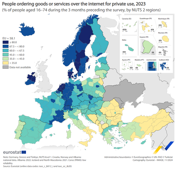 In 2023, 58.1% of people aged 16-74 in the EU reported that they had bought or ordered goods or services over the internet in the 3 months preceding the survey.