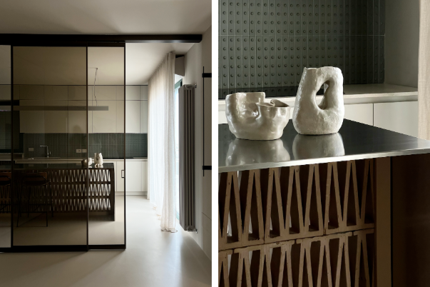 Within this visual grammar, Albed partitions integrate seamlessly. Two solutions were adopted: between the kitchen and living room, the Quadra system outlines a light wall through a wide sliding opening, mounted on a ceiling track, with black lacquered aluminium profiles and bronzed smoked glass panels—chosen to ensure visual continuity and stylistic coherence. In the sleeping area, the transition between the master bedroom and bathroom is created with sliding panels in natural aluminium and pleated glass, also from the Quadra collection. The texture of the panels creates the effect of a light, almost textile-like screen, punctuated by thin vertical stripes.