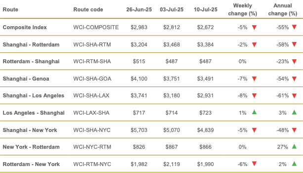 Global container shipping rates have dropped for a fourth consecutive week, according to Drewry's latest World Container Index (WCI), falling 5% to $2,672 per 40ft container.