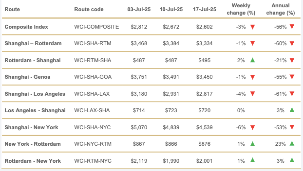 Drewry's World Container Index (WCI) has dropped for the fifth consecutive week, declining by 2.6% to $2,602 per 40ft container as of 17 July 2025. The fall signals a continued easing in the ocean freight market following a short-lived spike caused by US tariff hikes earlier this year.