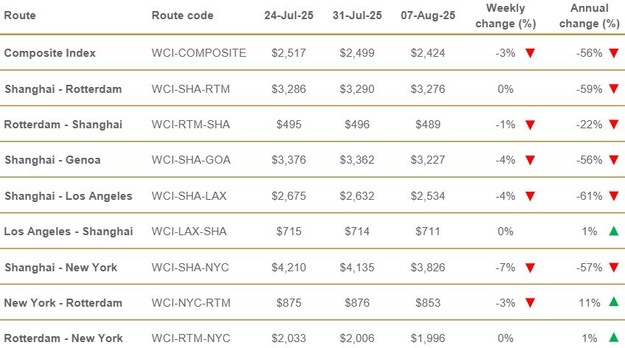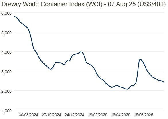 Drewry's World Container Index (WCI), a weekly index reflecting the average spot prices for transporting a 40-foot container on major global shipping routes, fell 3% to $2,424 per 40ft container in the week ended 7 August 2025. The decline follows a period of sharp price fluctuations that began in April, when the United States announced new import tariffs. This led to sharp increases in freight rates in May and early June, after which the market corrected sharply until mid-July. Since then, the rate of price decline has levelled off.