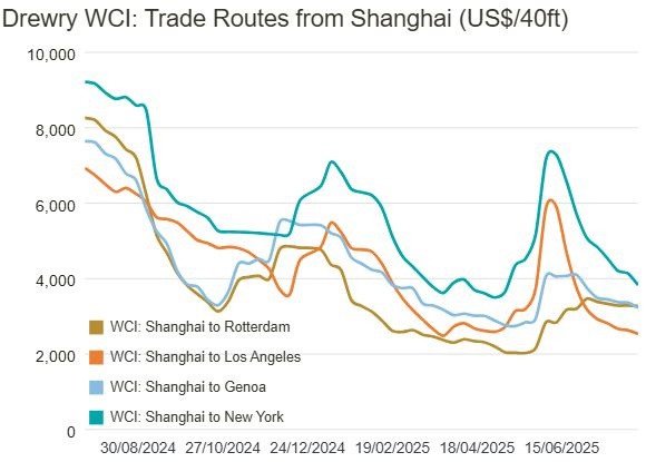 © DrewryTrans-Pacific routes in particular showed lower spot rates this week. Shanghai-Los Angeles fares fell 4% to $2,534 per FEU, while Shanghai-New York showed a sharp 7% drop to $3,826 per FEU. According to Drewry, the biggest shipping peak to ship goods before the tariff increase has now passed, which may lead to a more stable price pattern in the short term.