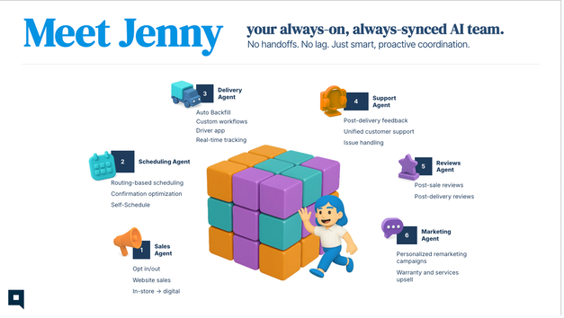 The platform is described by Anthony as 'AI native, built from the ground up to automate the post-purchase journey.' Its assistant, called Jenny, manages routine processes such as appointment confirmations and rescheduling through two-way SMS communication.
