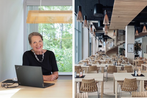 © Secto Design | Voll Arkitekter.Tuula Jusélius, founder and Creative Director of Secto Design (left) and Wood Hotel, Mjøstårnet, in Brumunddal, Norway. Photo by Voll Arkitekter (right).