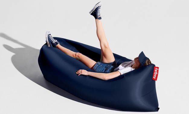 The Lamzac's characteristic sewn-up 'smoked sausage' shape is also clearly recognisable in the LayTube. Moreover, the LayTube has a buckle on one side, which can be closed by the user to keep the piece of furniture under tension or attached to something. In its buckled form, the LayTube looks even more like Fatboy's Union model.