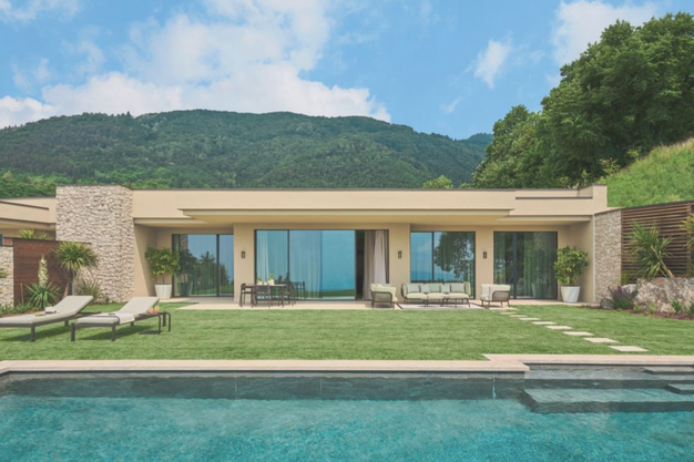 With green roofs and architecture embedded into the sloping hillsides above the lake, the villas comprise three two-bedroom units, one three-bedroom villa, and a penthouse, starting from 300 square metres. Each is arranged on a single level and features a private garden and infinity pool. The aesthetic is contemporary, defined by expansive glazing, soft neutral tones, and refined stone accents.