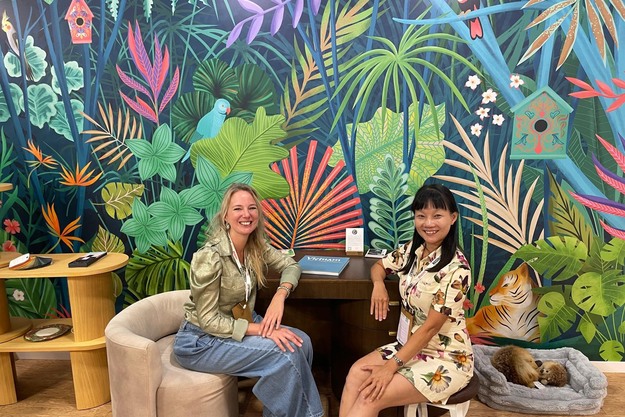Building on this synergy, Aurélie was invited to create a six-meter mural for Hévéa House's Maison & Objet presentation. Reinterpreted to echo the brand's tropical inspirations, the mural incorporates lush botanical elements and a symbolic tiger: a nod to Malaysia, where Hévéa House has its roots.