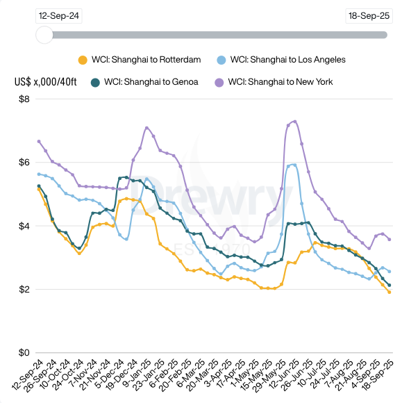 The Drewry World Container Index (WCI) recorded a further decline this week, falling 6% to $1,913 per 40ft container. This marks the 14th consecutive week of reductions, underlining continued weakness across major East–West trade routes.