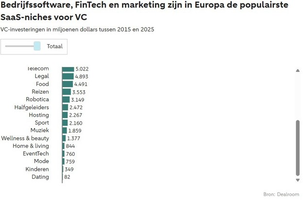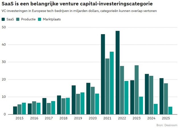 In 2024, young European technology companies collectively raised about 54 billion dollars in venture capital. Almost half of that, over 23 billion, flowed to Software-as-a-Service (SaaS). SaaS is thus the largest category, bigger than digital marketplaces or companies developing physical technology. For investors, the combination of stable subscriptions and scalability is particularly attractive.
