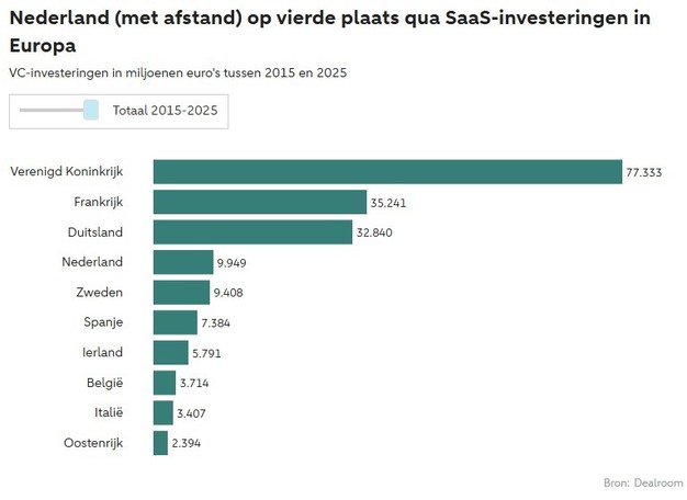 Within Europe, the United Kingdom attracts the most SaaS investments, with over 77 billion dollars in ten years, more than a third of the European total. France and Germany follow, with 35 billion dollars (16 percent) and 33 billion (15 percent), respectively. The Netherlands remains stable in fourth place at 9.9 billion, accounting for 4.5 percent of all European SaaS investments between 2015 and 2025.