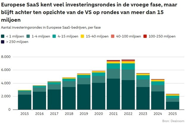 Unfortunately, Europe faces a persistent problem: the lack of capital for tech companies to grow into internationally competitive companies. U.S. startups are twice as likely to raise a round of more than 15 million dollars as their European counterparts, according to the 2024 State of European Tech report. As a result, the share of young companies advancing to the scale-up phase is much smaller in Europe. According to the researchers, the cumulative deficit now amounts to 375 billion dollars, the total amount young tech companies would have raised over the past decade if access to larger investments were as easy as in the United States (U.S.). In the U.S., a large portion of the money even goes to rounds over 100 million dollars, with a dominant role for mega deals over 250 million. Although not even so many fewer SaaS deals are closed in Europe, 4616 compared to 5040 in the U.S. in the past year, the focus remains on smaller rounds.
