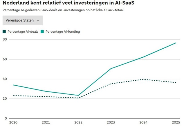 Within the broader landscape, AI-driven SaaS is taking up an increasingly larger place. In Europe, a third of software deals now fall into this category, accounting for nearly half of the investment volume. In the Netherlands, it's even two-thirds. The development is even faster in the U.S.; there, AI-SaaS gobbles up nearly 80 percent of all SaaS funding.