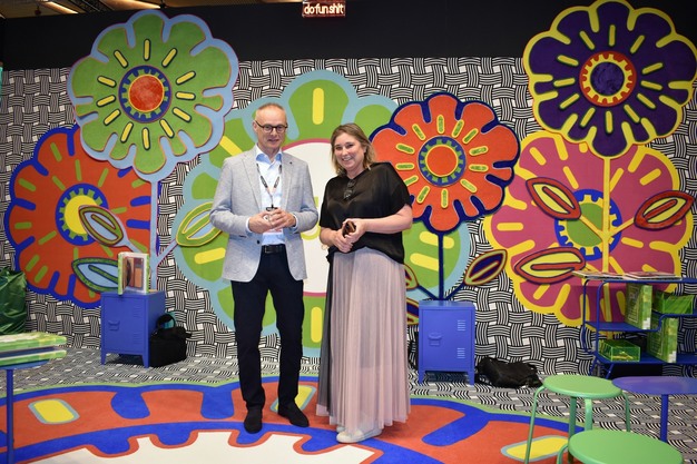 Managing director Geert De Clercq with spokeswoman Cole Brekoo in the colourful stand at the latest Flanders Flooring Days.