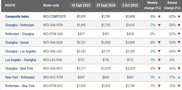 Drewry Supply Chain Advisors has reported a continued downward trend in global container freight rates, with the Drewry World Container Index (WCI) falling 5% to $1,669 per 40ft container for the week of 2 October 2025. This marks the 16th consecutive weekly decline and the lowest level since January 2024.
