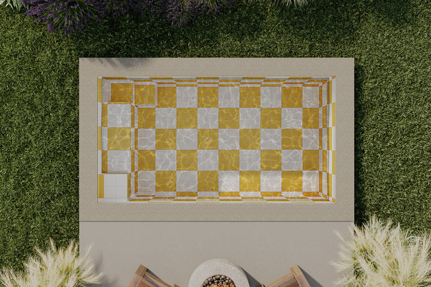 The Check + Stripe collection features crisp checkerboards and bold stripes in eight vibrant colourways. Plunge pools can be customised with small checks (8x8), large checks (16x16), or a chunky stripe (16") and installed above ground, partially recessed, or fully recessed. The precast pools, including models from 4' x 4' to 10' x 6', are designed for year-round use, offering both hot and cold plunge experiences. Outer walls can be finished in slate, tile, rock, or customised materials to enhance design impact.