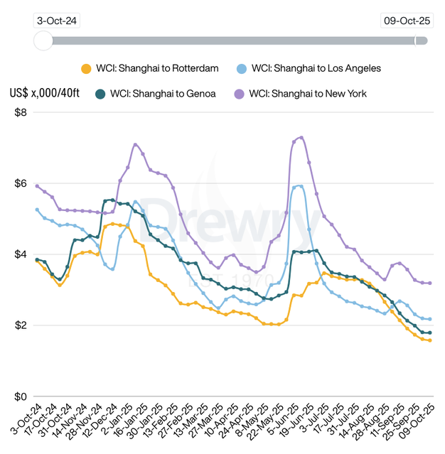 The sustained decline in freight rates underscores the easing of global shipping pressures seen since late 2024, as demand softens and capacity normalises across major ports.