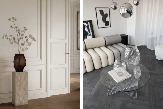 Each vase is a study in contrast—organic yet precise, raw yet refined. Mouth-blown glass versions scatter and bend light through their irregular surfaces, producing soft, shifting reflections throughout the day. High-gloss ceramic models amplify their surroundings, turning the sculptural form into a dynamic interplay of reflections and shadows. The vases, whether empty or holding a simple branch, act as quiet meditative objects, blending stillness and motion, clarity and distortion, refinement and rawness.
