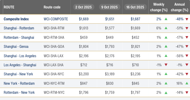 The Drewry World Container Index (WCI) rose by 2% to USD 1,687 per 40ft container for the week ending 16 October 2025, marking the first increase after 17 consecutive weeks of decline. The uptick was driven by General Rate Increases (GRIs) implemented by carriers on 15 October, although Drewry expects this momentum to be short-lived, with rates likely to soften again in the coming weeks.