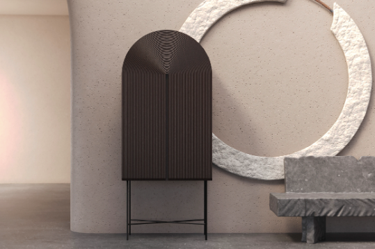 The Eternel line, recognised with major international design awards, highlights the nobility of solid wood. Its oak and dark marble dining table forms the centre of daily gatherings, while the bookcase combines graphic structure and functionality, embodying a refined yet essential aesthetic. Meanwhile, the Waves collection brings the fluid rhythm of nature into interiors, with sculpted surfaces that create a dynamic play of light and shadow. The bar cabinet's hypnotic geometry adds a quiet, iconic presence.
