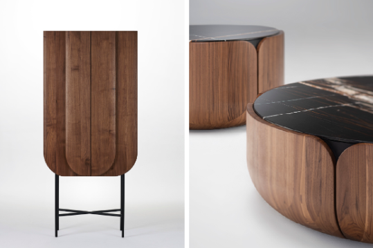Central to this vision is the Bloom collection, featuring sculptural pieces inspired by flowers in bloom. The large walnut and marble dining table encourages conviviality and storytelling, while the coffee table captures the fleeting grace of a flower in a sculptural form. A bar cabinet opens like a blossoming bud, revealing hidden details that surprise at every encounter.