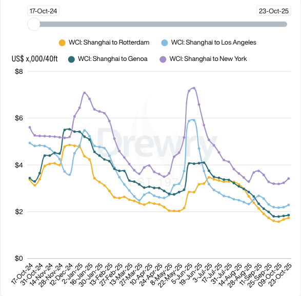 Spot rates from Shanghai to Los Angeles rose 4% to $2,290 per 40ft container, while rates to New York increased 6% to $3,420. On the Asia–Europe trade, rates from Shanghai to Rotterdam jumped 4% to $1,736, and to Genoa climbed 2% to $1,855. Drewry attributes the upward trend to recent general rate increases (GRIs) introduced mid-October, with further GRIs planned for 1 and 15 November, aimed at securing higher prices before the current increases stabilise.