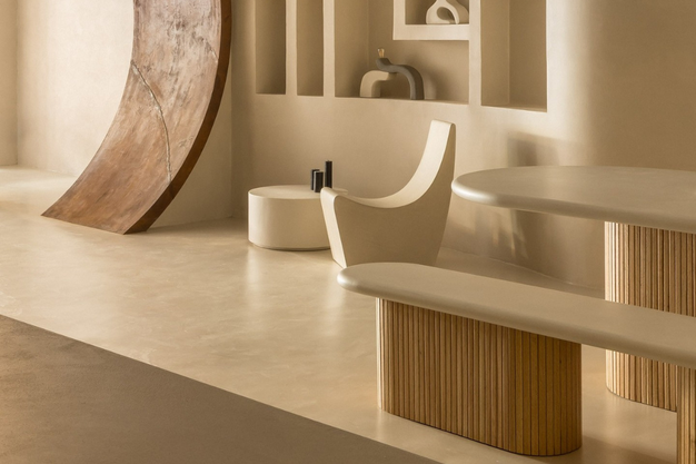 The Valencia showroom, opened in 2024, is described by the studio as a space to explore the technical and design capacities of microcement in furniture. The company emphasises the adaptability of its designs to different project requirements.