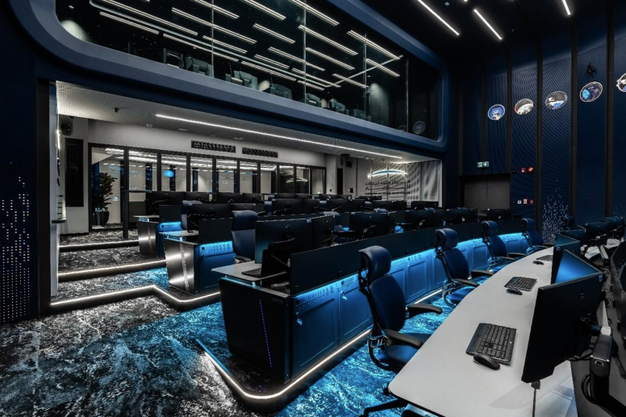 The challenge was to create a workspace that supports extended periods of critical operations while enabling teams to maintain focus under high-pressure conditions. The resulting 10,000-square-foot environment combines futuristic minimalism with ergonomic precision. A disciplined palette of deep blues, blacks, and metallic tones evokes the vastness of space while reducing visual fatigue, while acoustic panels, ambient lighting, and carefully selected materials all contribute to enhancing cognitive clarity and comfort.