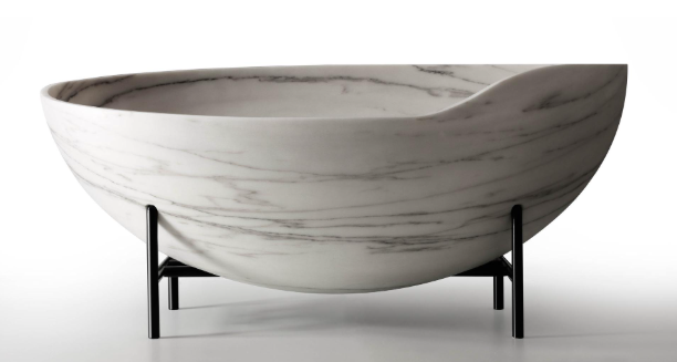 Finally, Kora is the Kreoo bathtub designed by Enzo Berti. With its sinuous and soft lines, it appears as a monolith carved from a single block. Though its edge develops at varying heights, facilitating entry and creating an aesthetic of great refinement. The oval marble body is raised on a stand with a gold, dark bronze or matt black finish, and seems to float on this slender metal structure, in an extraordinary design.