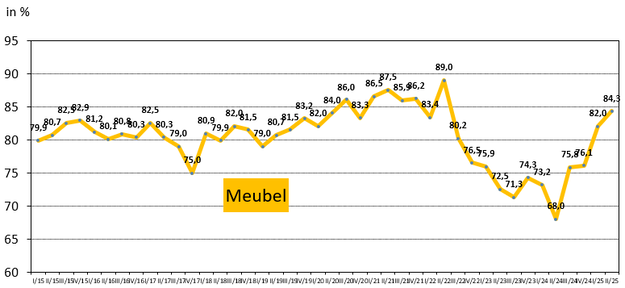 The capacity utilisation rate in the Belgian furniture industry fell to an average of 73% in 2023 and 2024, the lowest level in a decade. In the first six months of 2025, capacity utilisation climbed above 80% again, to 83.2%, bringing the sector back to normal levels.