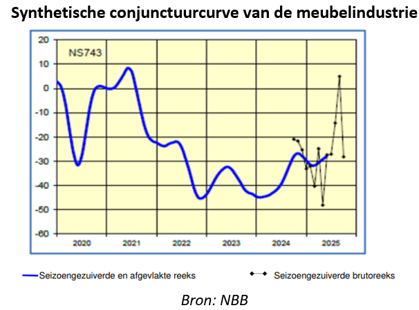 The furniture industry's business cycle curve - a key measure of business confidence that is on average three months ahead of real economic activity - rose dramatically in the May-August 2025 period. For the first time in a long time, the curve rose above zero, meaning that more business leaders are optimistic than pessimistic about the future evolution of the sector. However, a sharp decline followed in September 2025.