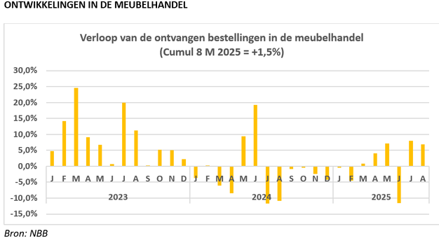 The level of orders in the furniture trade in 2025 remains rather low, although since the summer months a turnaround seems to be in place, with growth figures in July and August after a weak June. Cumulatively for the first eight months, orders were 1.5% higher than in 2024.