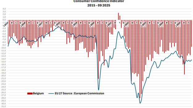 After an all-time low in mid-2022 due to the energy crisis, Belgian and European consumer confidence recovered in 2023 and 2024. From the end of 2024 onwards, the mood flipped again and Belgian and European consumers became more pessimistic, but since May 2025 an upward trend is again noticeable.