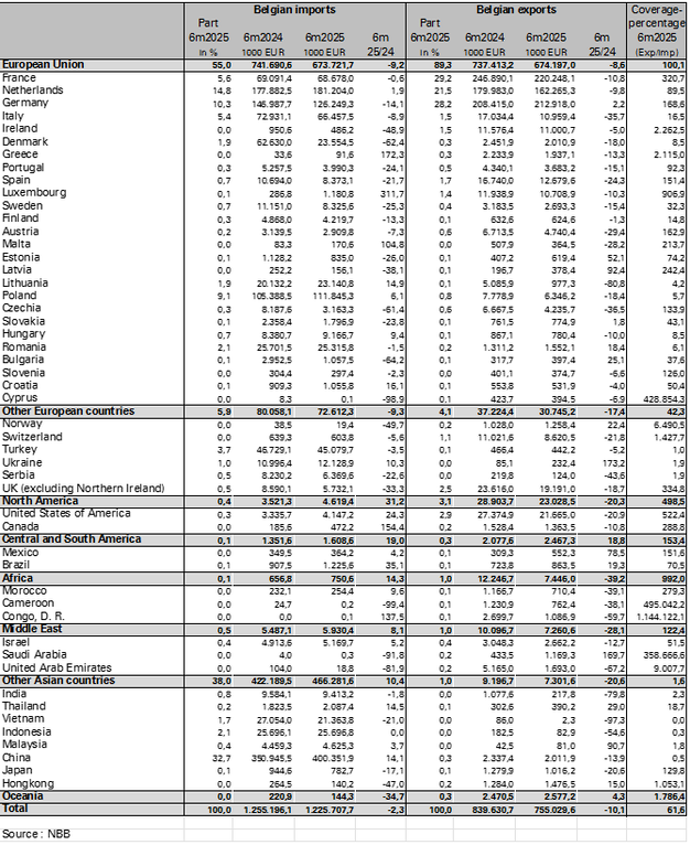 Belgian furniture exports (including transit) fell by 1.5% in 2024 and dropped sharply further by -10.1% in the first half of 2025 compared to the same period a year earlier. About 89% of exports go to the EU market, where deliveries were down 8.6%.