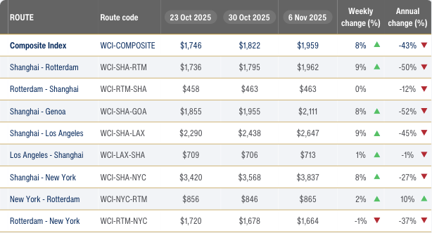 Drewry's World Container Index (WCI) rose 8% this week to $1,959 per 40ft container, marking the fourth consecutive weekly increase following a 17-week decline. Spot rates from Shanghai to Los Angeles climbed 9% to $2,647, while shipments to New York increased 8% to $3,837, driven by general rate increases (GRIs) introduced on 1 November.